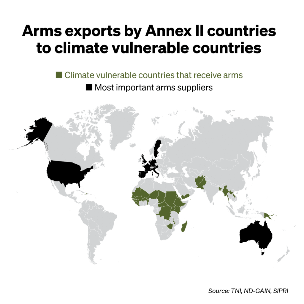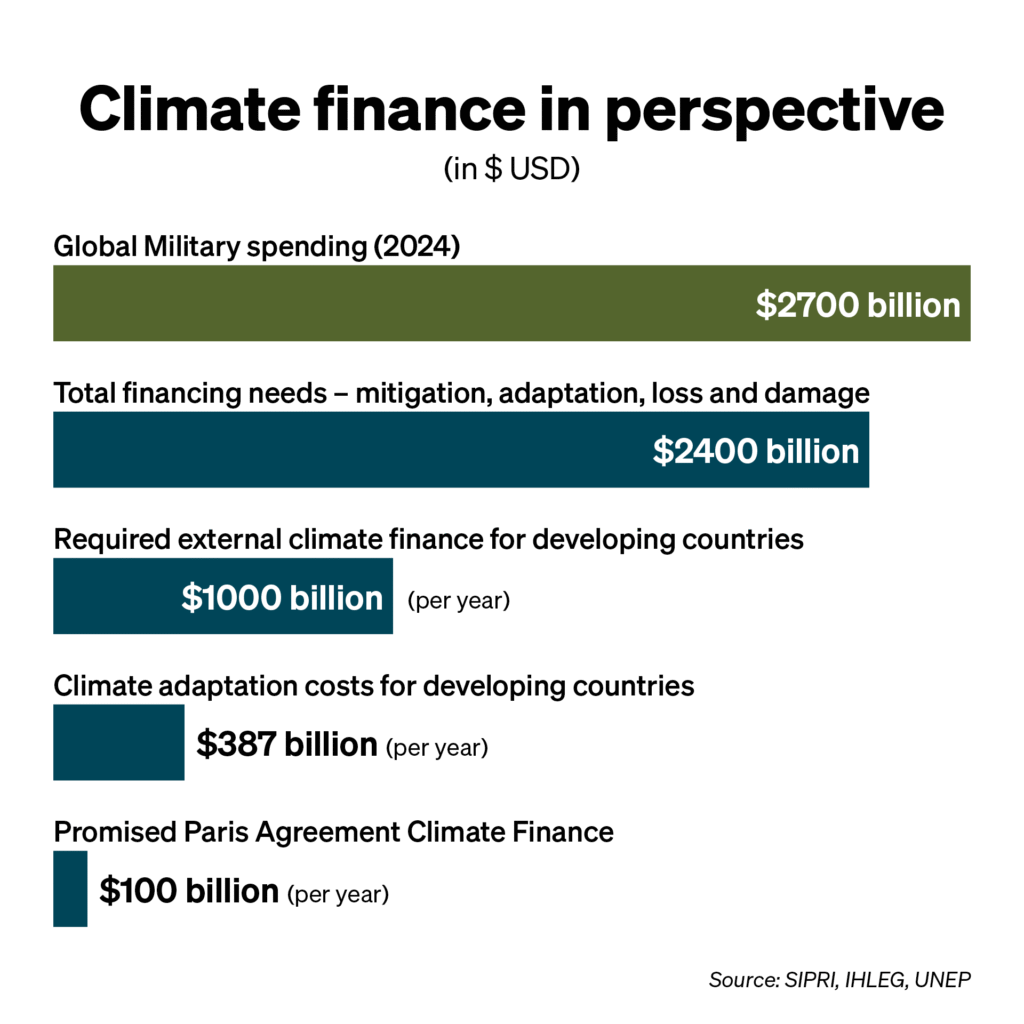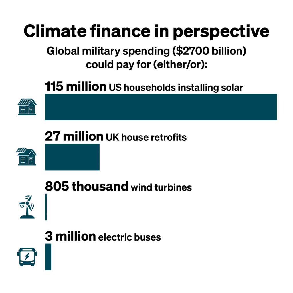 While climate finance falls short, military spending soars. The $2.7 trillion global military budget in 2024 could instead fund a monumental green transition, paying for 115 million US household solar installations, 27 million UK house retrofits, or 805,000 wind turbines. Meanwhile, the richest nations are exporting weapons to the world’s 40 most climate-vulnerable countries, fueling conflicts in regions like the Sahel instead of providing the necessary finance to cope with climate impacts.