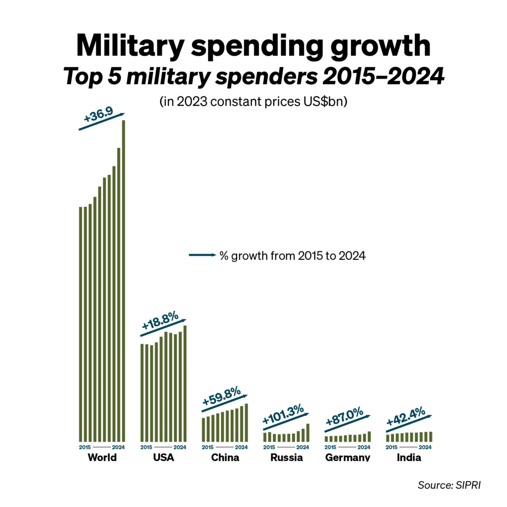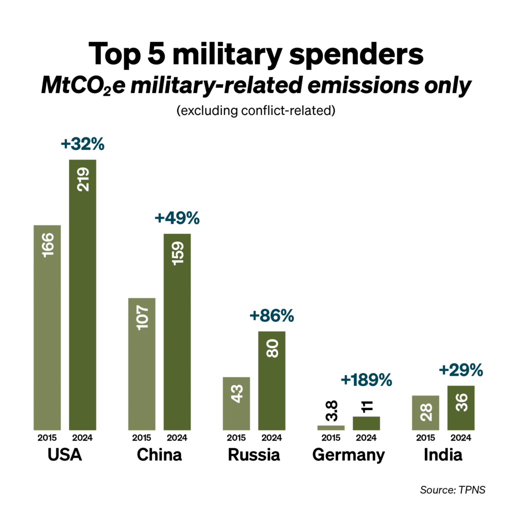 The largest historical GHG emitters are also the biggest military spenders, a correlation that is not coincidental but rooted in the intertwined history of fossil fuel expansion and military power. Global military spending has grown by 37% in the last decade, with the top five spenders (US, China, Russia, Germany, India) showing increases ranging from 18.8% to 101.3% from 2015 to 2024. This growth is set to continue, with NATO’s recent commitment for members to spend 5% of GDP on the military potentially doubling expenditures to $19 trillion between 2025-2030 and generating an additional 840 million tonnes of emissions.