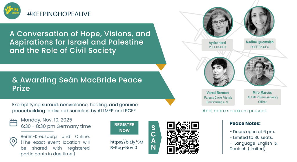 #SeánMacBridePeacePrize #PeaceBuilding #IsraelPalestine #PCFF #ALLMEP #IPB #CivilSociety #DialogueForPeace