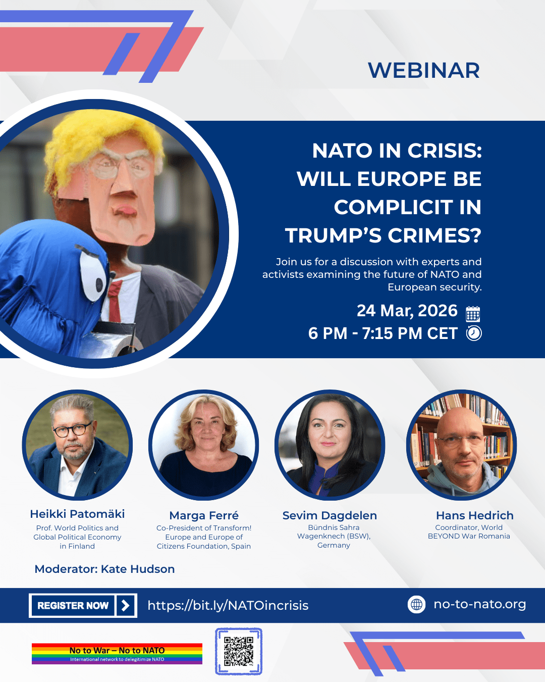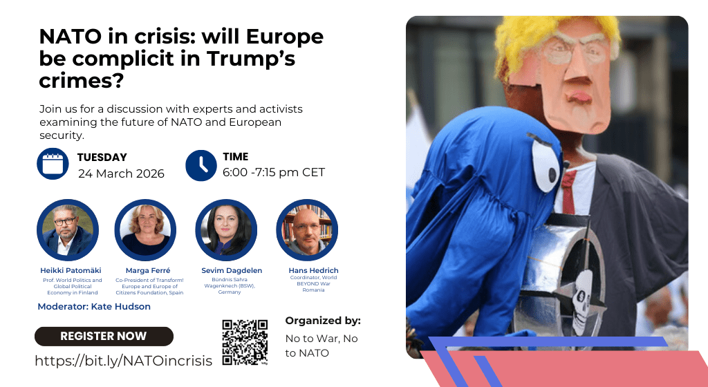 NATO has become a flashpoint for Trump’s disordering of the world. He’s giving his so-called allies in Europe a good kicking, politically and economically. He’s demanding vast sums are spent on weapons and war, preferably from US companies. And he’s pushing them to support his latest criminal war on Iran. Not all leaders of the European NATO states have the principles of the Spanish prime minister – calling out genocide and opposing the war on Iran. Others embrace the war narrative, spending their national resources on killing instead of socially useful spending. At this webinar we ask key questions: