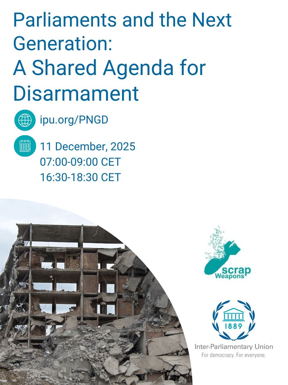 The global security landscape is shifting as long-standing disarmament challenges converge with emerging risks driven by new technologies and rising geopolitical tensions. These dynamics amplify the need for transparent, responsible and people-centred approaches to security. This webinar, organised in partnership with the Strategic Concept for Removal of Arms and Proliferation (SCRAP) hosted by the School of Oriental and African Studies (SOAS) University of London, will examine how parliaments can strengthen their legislative, budgetary and oversight roles to address these evolving risks, integrate youth perspectives and expertise into national debates, and reinforce international cooperation on disarmament. It will highlight how meaningful engagement with young MPs and experts can help ensure that future security policies remain inclusive, forward-looking, and firmly grounded in peace, human rights and global stability.