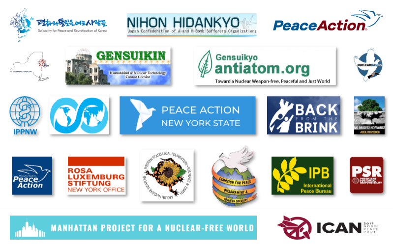 Cosponsoring Organizations include: Abolition 2000;Back from the Brink; Campaign for Peace, Disarmament and Common Security; Gensuikin (Japan Congress against A- & H- Bombs); Gensuikyo (Japan Council against A- & H- Bombs); International Campaign to Abolish Nuclear Weapons, International Peace Bureau; International Physicians for the Prevention of Nuclear War; Manhattan Project for a Nuclear Weapons-Free World; Massachusetts Peace Action; Nihon Hidankyo (Japanese Confederation of A- & H- Bomb Survivors Organizations; Nuclear Ban US; Pax Christi New York State: Peace Action; Peace Action New York State;; Physicians for Social Responsibility; Rosa Luxemburg Stiftung; SPARK; Western States Legal Foundation; World Beyond War