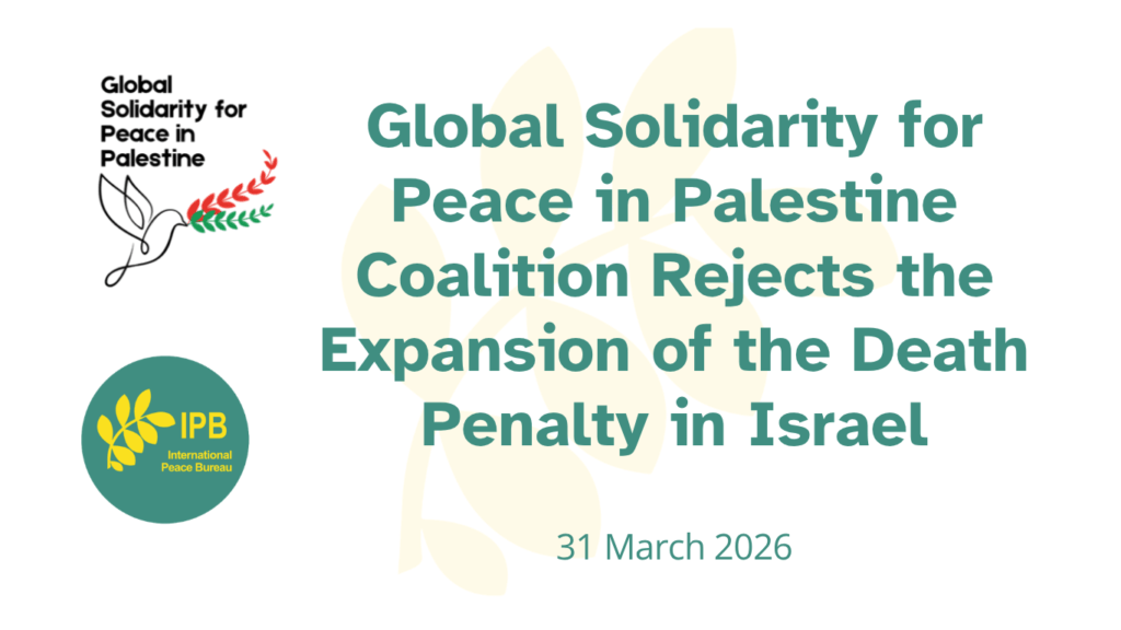 March 31, 2026 | By: Global Solidarity for Peace in Palestine Coalition (GSPP) *The International Peace Bureau is a member of the GSPP. The Global Solidarity for Peace in Palestine Coalition of over 100 organizations across four continents expresses grave concern regarding legislative and political...